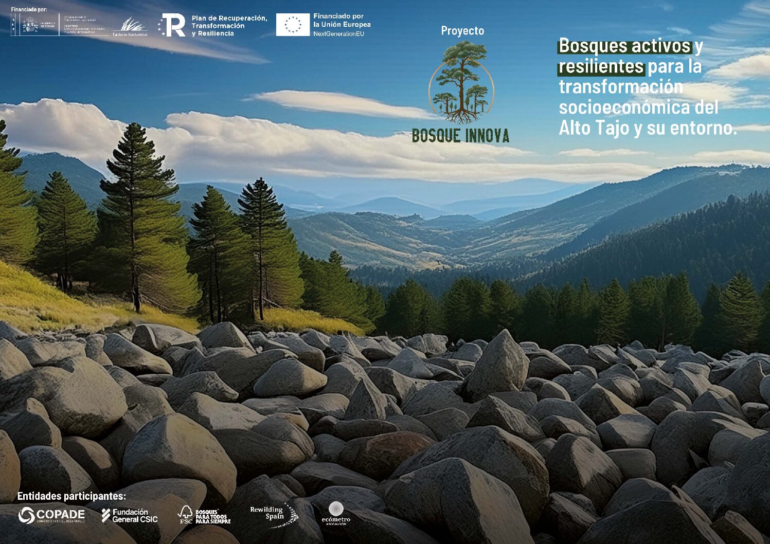 Bosque Innova es un proyecto dirigido a la creación de empleo y emprendimiento verde, a revertir la despoblación, promover la gestión forestal y mejorar la biodiversidad en el sistema Ibérico Sur, en el que la Fundación General CSIC participa junto con Fundación COPADE, Rewilding Spain, FSC y Asociación Ecómetro. Bosque Innova cuenta con el apoyo de la Fundación Biodiversidad del Ministerio para la Transición Ecológica y el Reto Demográfico (MITECO) en el marco del Plan de Recuperación, Transformación y Resiliencia (PRTR), financiado por la Unión Europea – NextGenerationEU.