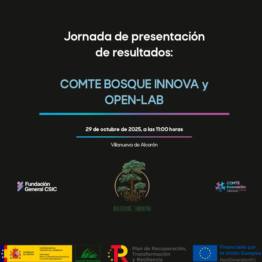 Bosque Innova es un proyecto dirigido a la creación de empleo y emprendimiento verde, a revertir la despoblación, promover la gestión forestal y mejorar la biodiversidad en el sistema Ibérico Sur, en el que la Fundación General CSIC participa junto con Fundación COPADE, Rewilding Spain, FSC y Asociación Ecómetro. Este proyecto cuenta con el apoyo de la Fundación Biodiversidad del Ministerio para la Transición Ecológica y el Reto Demográfico (MITECO) en el marco del Plan de Recuperación, Transformación y Resiliencia (PRTR), financiado por la Unión Europea – NextGenerationEU.