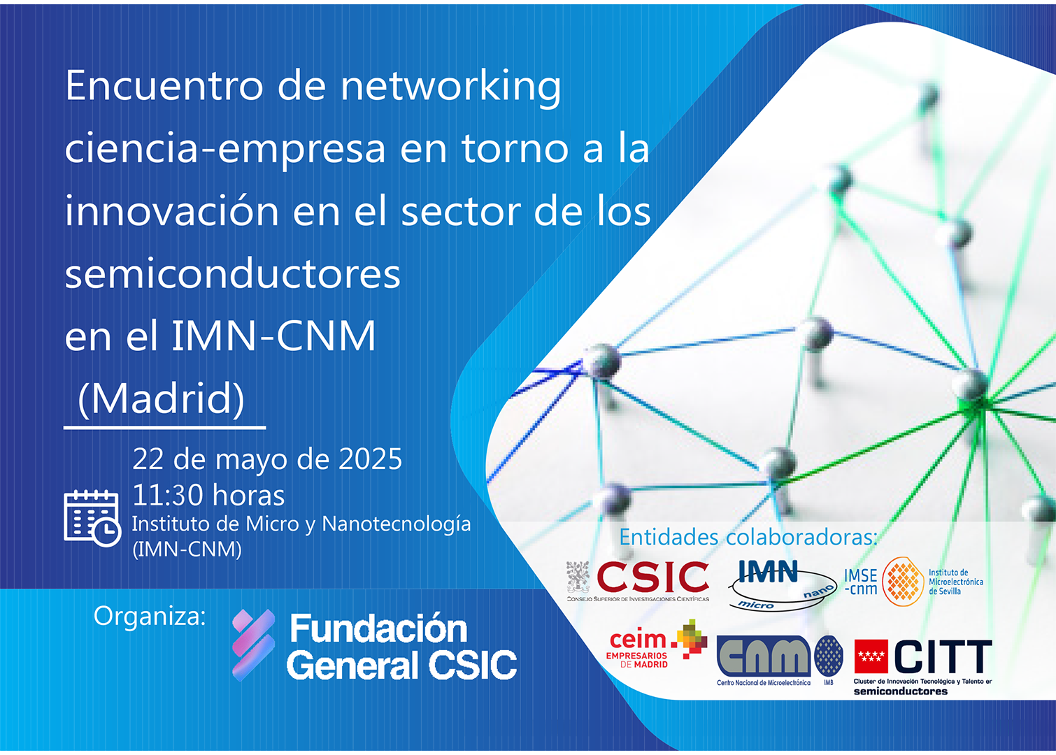 La Fundación General CSIC (FGCSIC), en colaboración con el Instituto de Micro y Nanotecnología (IMN-CNM), el Instituto de Microelectrónica de Sevilla (IMSE-CNM), el Instituto de Microelectrònica de Barcelona (IMB-CNM), junto a CEIM, Confederación Empresarial de Madrid-CEOE y el Clúster de Semiconductores de Madrid, organizan un encuentro entre empresas e investigadores, en torno a la innovación en el sector de los semiconductores y su aplicación al sector productivo.