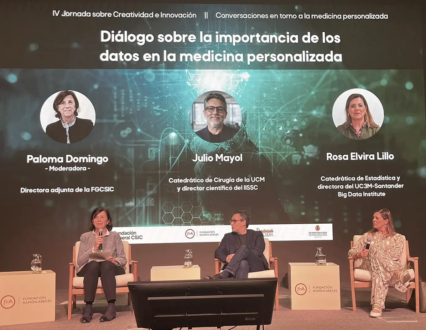 Tras esta conferencia, la jornada se centró en su primer eje temático, centrado en la relevancia de los datos en la medicina personalizada. Este bloque se desarrolló a través de un diálogo entre Julio Mayol, catedrático de Cirugía, delegado del decano para Nuevas Tecnologías y director científico del Instituto de Investigación Sanitaria San Carlos (IdISSC), y Rosa Elvira Lillo, catedrática de Estadística y directora del UC3M‑Santander Big Data Institute. La conversación, moderada por Paloma Domingo, directora adjunta de la Fundación General CSIC, permitió analizar el papel estratégico del uso avanzado de datos como apoyo a la toma de decisiones clínicas.