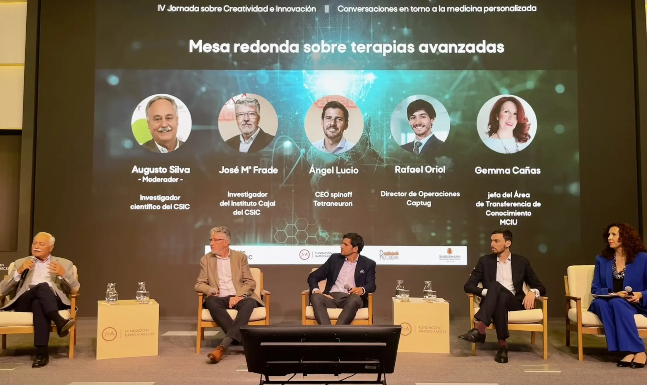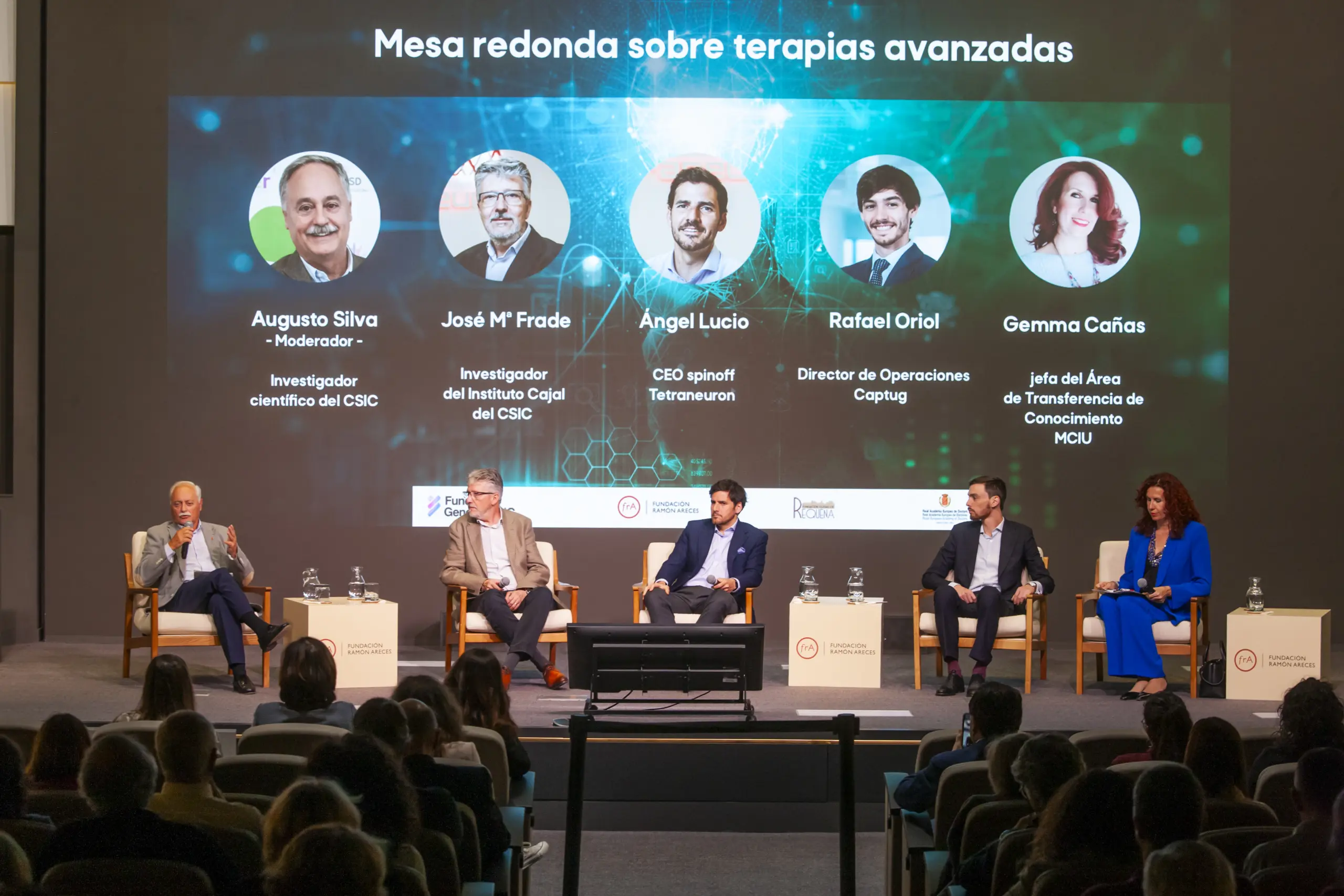 El segundo gran eje de la jornada se articuló en torno a una mesa redonda sobre terapias avanzadas, que reunió a representantes del ámbito investigador, empresarial e institucional. En ella participaron José María Frade, investigador del Instituto Cajal del CSIC; Ángel Lucio, CEO de la spin‑off Tetraneuron; Rafael Oriol, director de Operaciones de Captug; y Gemma Cañas, jefa del Área de Transferencia de Conocimiento del Ministerio de Ciencia, Innovación y Universidades. La mesa estuvo moderada por Augusto Silva, investigador científico del CSIC, y sirvió para debatir sobre los retos y oportunidades en la transferencia al sistema sanitario de este tipo de innovaciones.