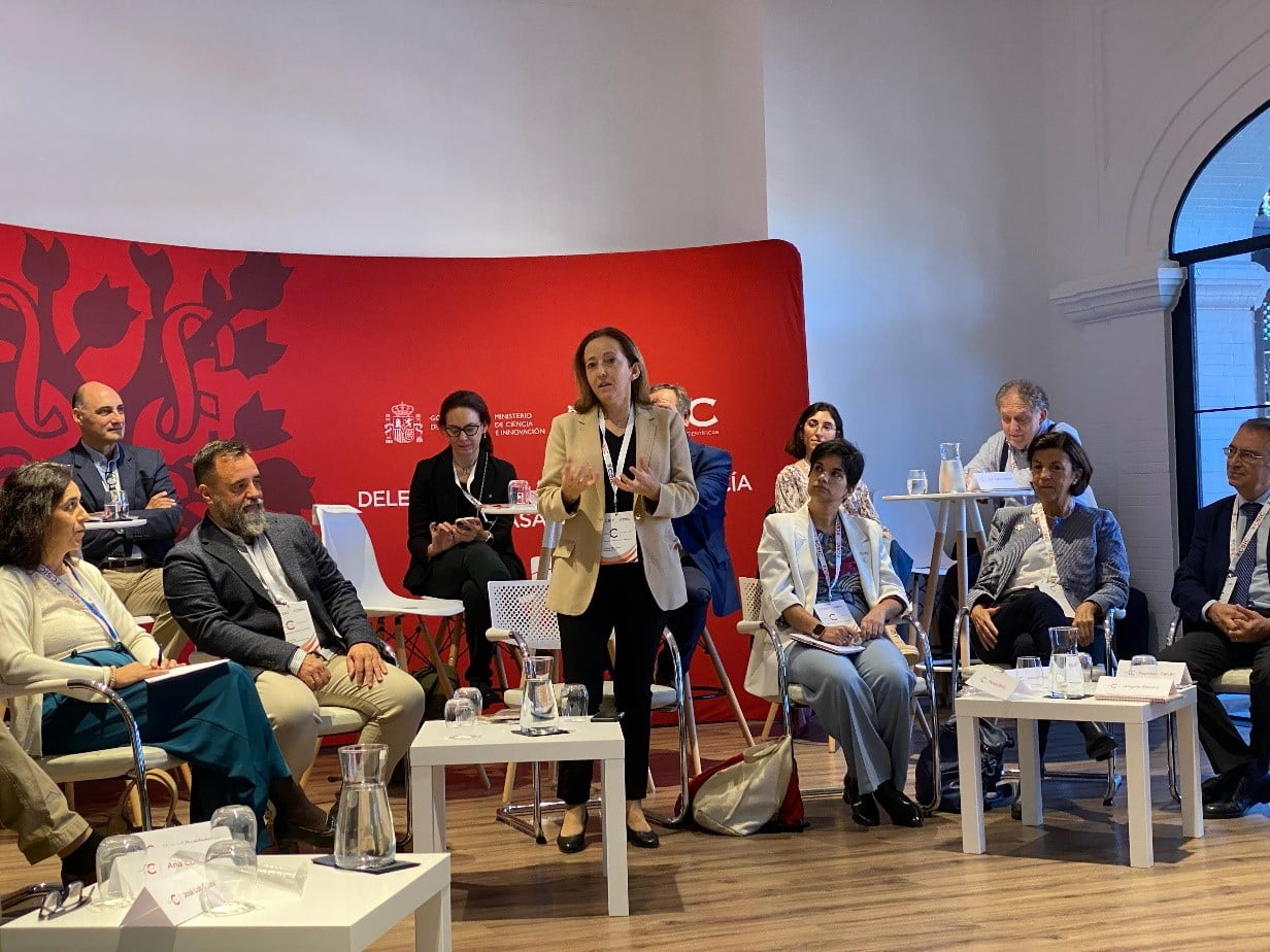El encuentro de hoy ha reunido a las investigadoras Teresa Serrano y Piedad Brox, del Instituto de Microeléctrónica de Sevilla (IMSE), un centro mixto del CSIC y la Universidad de Sevilla; a Ángel Barranco, del Instituto de Ciencia de Materiales de Sevilla (ICMSE), también mixto del CSIC y la Universidad de Sevilla, quien ha abordado el tema de la fabricación sostenible de nanomateriales para energías limpias. Asimismo, ha contado con la participación de José Luis Costa Krämer, del Instituto de Micro y Nanoelectrónica de Madrid (IMN-CSIC); Txetxu Ausín, presidente del Comité de Ética del CSIC e investigador del Instituto de Filosofía (IFS-CSIC); y Ángela Ribeiro, investigadora del Centro de Automática y Robótica (CAR CSIC-UPM). El encuentro ha sido moderado por los investigadores Bernabé Linares, del Instituto de Microeléctrónica de Sevilla (IMSE), y Asunción Fernández, del Instituto de Ciencia de los Materiales de Sevilla (ICMS). Al encuentro han asistido la presidenta del CSIC, Eloísa del Pino, la delegada institucional del CSIC en Andalucía, Margarita Paneque, y la directora adjunta de Fundación General CSIC, Paloma Domingo.