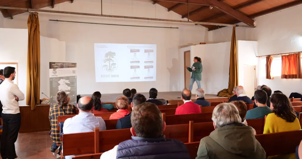 La jornada se abrió con la bienvenida del alcalde de Villanueva de Alcorón, Faustino Martínez, quien subrayó el valor de iniciativas como Bosque Innova para dinamizar la economía local a través de la gestión responsable del mundo rural. A continuación, Jorge Cabero, de la Fundación General CSIC, y Marta Corella, de Fundación COPADE, presentaron las líneas principales, los objetivos y los avances logrados por Bosque Innova en su desarrollo, y destacaron su contribución a la regeneración ecológica, social y económica de los territorios rurales del Sistema Ibérico Sur.